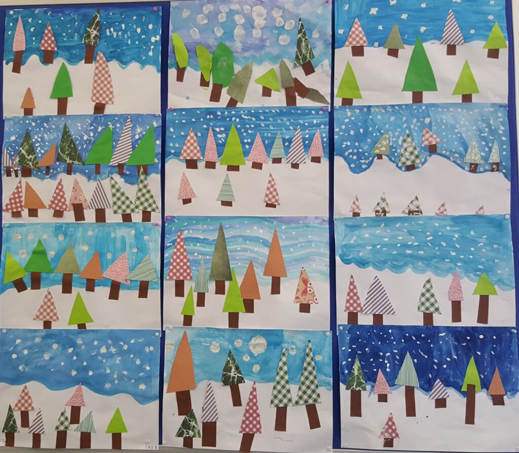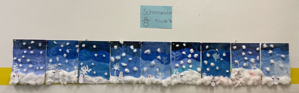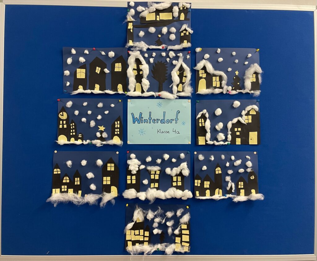 Im Kunstunterricht haben wir in den letzten Wochen ein Winterdorf und eine schöne Schneelandschaft mit Schneemann erstellt! Wir hatten jede Menge Spaß dabei! Wir sind stolz darauf, euch die Bilder vor unserer Klasse im Flur präsentieren zu können! Kommt gerne vorbei und schaut euch unsere Kunstwerke an!